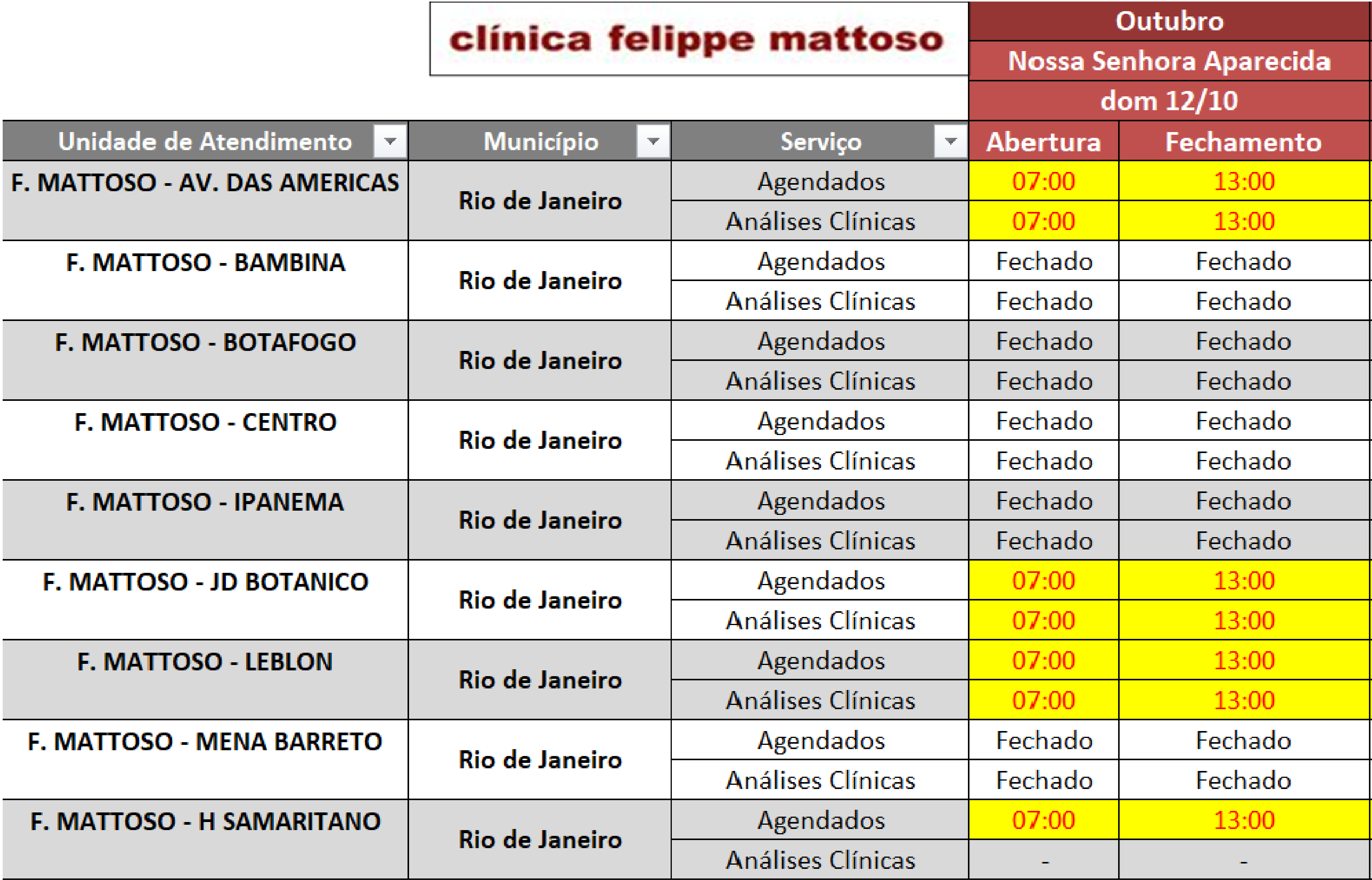 No dia 12 de outubro, feriado do Dia de Nossa Senhora Aparecida, as unidades da Clínica Felippe Mattoso estarão funcionando com os seguintes horários especiais: